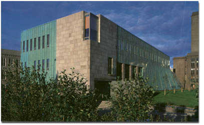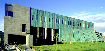 Nýbygging Hæstaréttarf er einföld og skrautlaus, enda annað vart við hæfi í húsi þar sem jafn alvarleg örlög eru ráðin. Skáhallarýmið bak við endilangan sveigðan suðurvegginn er þungamiðja hússins og eins konar framhald grasflatarinnar sunnan glerveggjarins. Grasflötin hækkar í norðaustur þannig að innkeyrsla í bílageymslu er falin að baki hennar undir suðausturhorni hússins”.