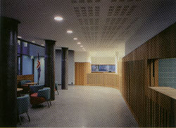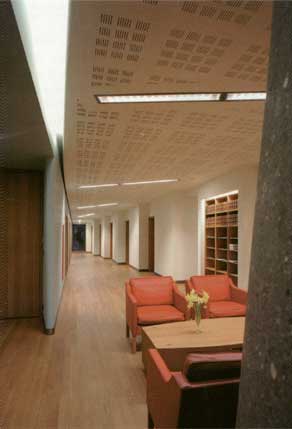 Séð upp hallann frá stærri dómsalnum að minni dómsalnum, þingsal og skrifstofu forseta Hæstaréttar.