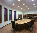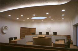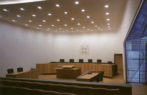 Aðstaða lögmanna og viðtalsherbergi eru í lágbyggingu austan við aðaldómsal, með beinum inngangi lögmanna í norðurausturhorni salarins. Aðstaða dómara er í bogadregnu norðvesturhorni annarrar hæðar og veitir beina inngöngu í báða dómsali og þingsal...